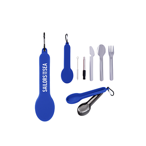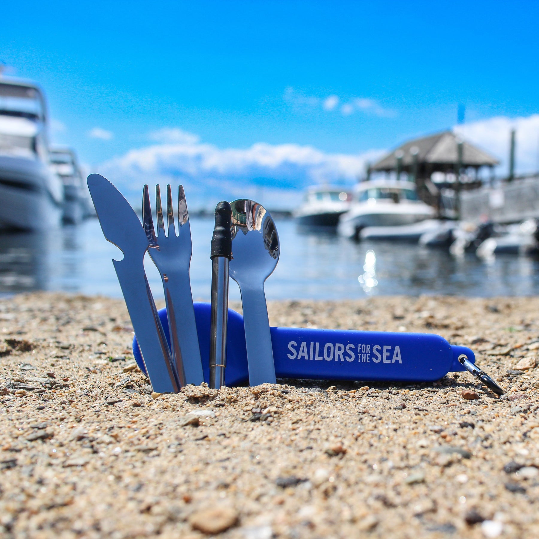 This stainless-steel travel utensil set features a fork, spoon, knife and collapsible straw with wire cleaning brush, which nests in a silicone Sailors for the Sea holder.
